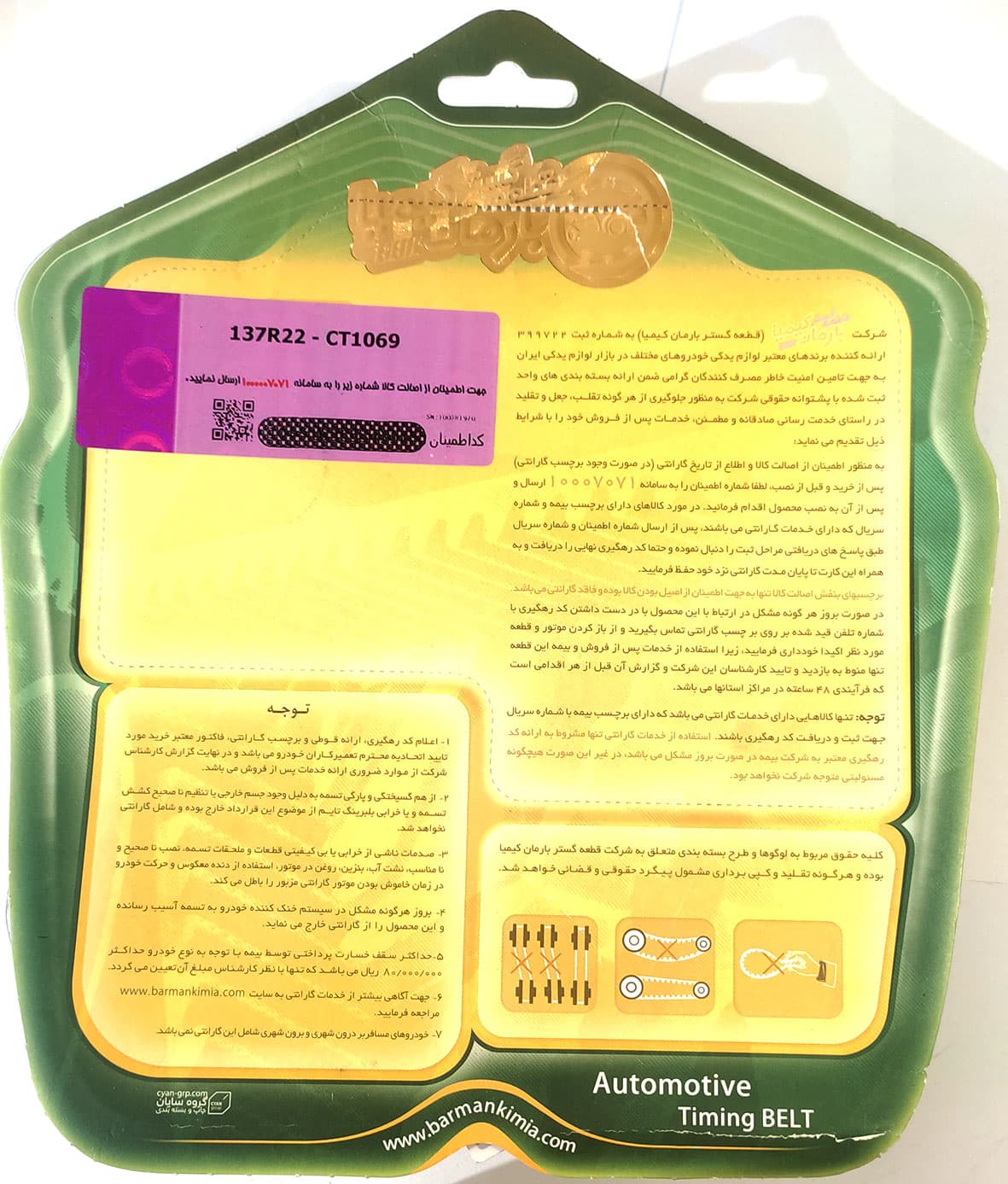 شرکت بارمان کیمیا بهعنوان نماینده رسمی و انحصاری خدمات پس از فروش تسمههای Contitech (از زیرمجموعههای اصلی برند جهانی Continental) در بازار قطعات یدکی خودرو ایران فعالیت میکند. این شرکت اعلام کرده است که هر تسمهای که فاقد برچسب یا هولوگرام فارسی بارمان کیمیا باشد، غیر اصلی محسوب میشود و عرضه یا فروش آن میتواند پیگرد قانونی داشته باشد.برای اطمینان از اصالت محصولات، بارمان کیمیا سیستم استعلام اصالت کالا را فراهم شده است. خریداران میتوانند با استفاده از شماره اطمینان ۱۳ رقمی یا کد مخصوص تعمیرکار، اصالت تسمه را در سامانه شرکت بررسی کنند.همچنین برای بخشی از محصولات خود—از جمله تسمهتایم مخصوص خودروهای پژو ۴۰۵، پارس و سمند—ضمانتنامه رسمی با پوشش بیمه کارآفرین ارائه میدهد. این ضمانت شامل ۱۸ ماه یا ۷۰هزار کیلومتر کارکرد است که نشاندهنده سطح بالای اعتماد شرکت به کیفیت تسمههای ارائهشده میباشد.